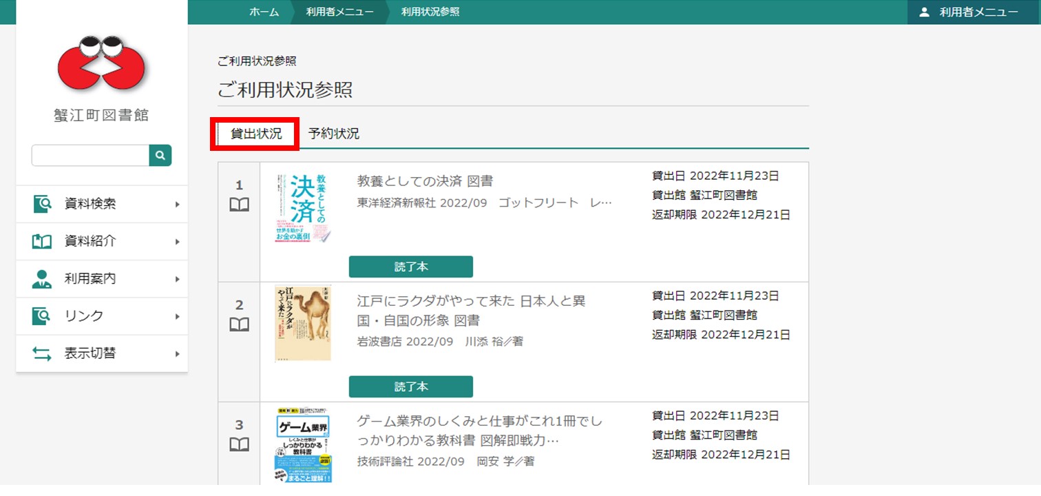 ログイン後、利用状況確認画面で、貸出状況と予約状況の確認ができます。