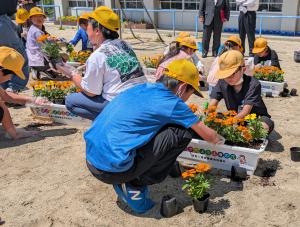 当日は、人権の花として育ててもらうマリーゴールドとペチュニアが贈呈され、6年生児童で苗植えを行いました。